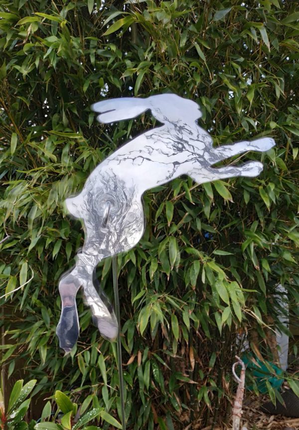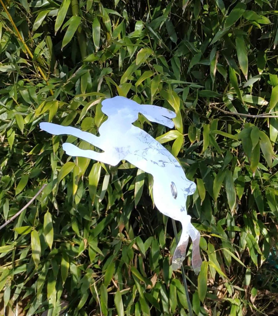Planished and polished aluminium hare garden ornament. Introduced in 2019 to compliment the existing garden collection. The hare stands approximately 1m tall on an aluminium stick to allow it to sway in the wind. Keep it out all year as it weathers very well.