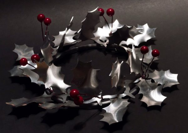 A table decoration suitable for Christmas with a candle in the middle. All the hand made leaves and their sharp points raise above the frame so protecting the table. Decorated with deep red holly berries to add a little colour. The support wire, which makes contact with the table surface is protected by plastic tubing.